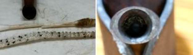 The next afternoon, Abha fished out the stem from the deoxidizer solution and scrubbed it with a Scotch Brite pad to get rid of the loosened oxidation from the surface. She followed this scrub with a second scrub using 0000 grade steel wool and this helped in further removal of raised oxidation from the surface and even out the minor scratches resulting from using the Scotch Brite pad. She rinsed the stem under warm running water to completely remove the solution from the airway and slot end. She ran a couple of pipe cleaners to remove the last traces of residual deoxidizer solution from the airway and dry out the airway.