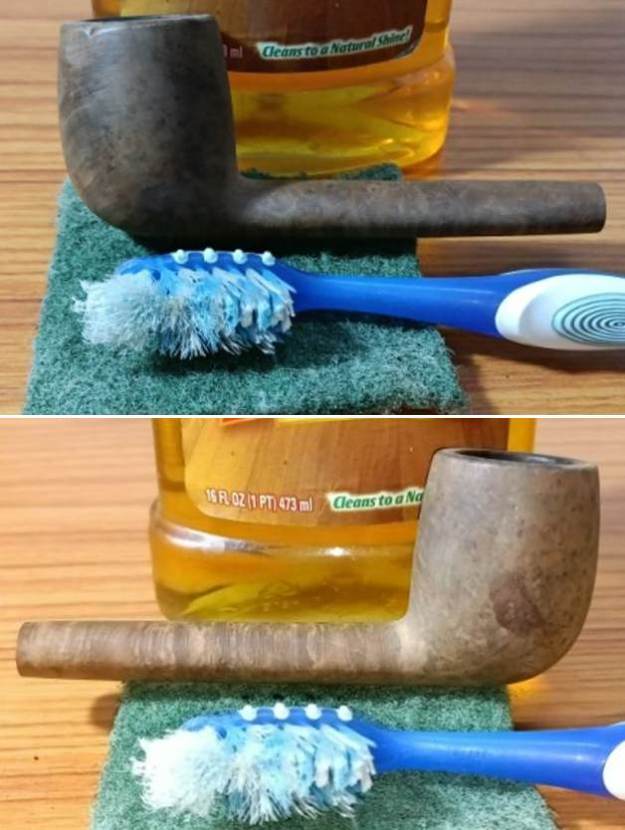 Next, I cleaned the external surface of the stummel with undiluted Murphy’s oil soap and a hard bristled toothbrush. I cleaned the smooth rim top surface with the soap and Scotch Brite pad. The darkened areas over both sides of the stummel and the rim top surface are now clean, exposing the gremlins hidden beneath the layer of dirt.