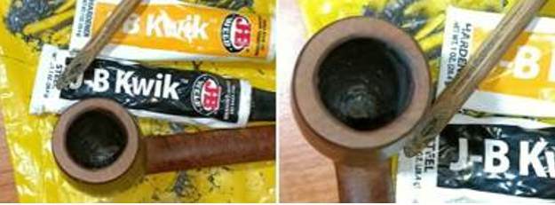 Next, to protect and isolate the chamber walls from coming into direct contact with the burning tobacco and prevent a burn out, I coated the walls of the chamber with an even layer of J B Weld. J B Weld is a two-part epoxy Cold Weld in two tubes; hardener and steel which are mixed in two equal parts (ratio of 1:1) with hardening time of 5-6 minutes and complete curing time of 6-8 hours. I poured the contents of the two tubes on to a plastic sheet and mixed it well. I inserted a petroleum jelly coated regular pipe cleaner through the draught hole to prevent it from getting blocked due to the J B Weld mix. I applied this mix, as evenly as possible, over the entire chamber wall surface. I worked fast to ensure an even coat over the chamber walls before the weld could harden and set the stummel aside for the application to harden and cure overnight.