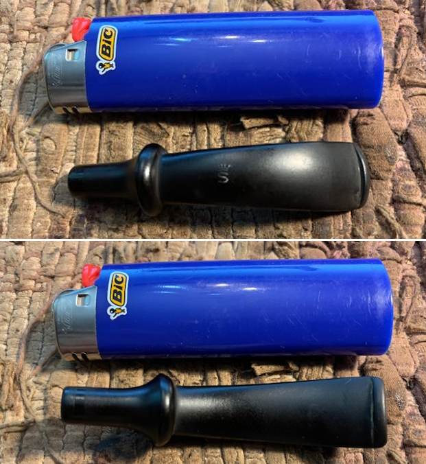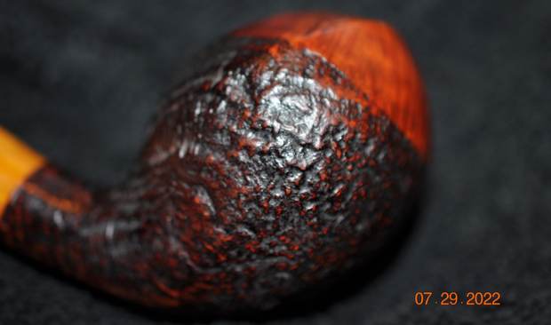 The next pipe really caught our attention with the variegated finish on the bowl – both smooth and sandblast. The orange/apricot acrylic shank extension looked great with the briar. Jeff picked it up from an antique mall on 05/10/22 in Astoria, Oregon, USA. The bowl had some interesting grain on both the smooth portion and the sandblast portion. The straight line transition is sharp and clear. There was a lot of dust and debris in the grooves of the blast and there was a thick cake in the bowl. There was a thick overflow of lava on the rim top and the inner edge of the bowl. The interior of the pipe was filthy with oils and tars. The acrylic shank extension had a lot of cracks and fissures but still appeared to be solid. The stem had a Stanwell Crown S on the top of the saddle. It was oxidized, calcified and had tooth marks and chatter on both sides near the button. The pipe was a real mess but it was also a beauty. Jeff took photos of the pipe before he started his clean up work on it. He took photos of the bowl and rim top as well as the stem to show the general condition of the pipe. You can see the thickness of the cake in the bowl and the lava on the rim top. The bowl and rim are a mess. There is also a lot of grim ground into the finish that is visible in the photos. The stem photos show the oxidation, calcification and the tooth marks on chatter on both sides. He took photos of the sides and heel of the bowl to give a sense of the finish and shape of the bowl. It is an interesting ¾ bent Rhodesian if held right and otherwise appears like a scoop. It really has some unique beauty to it. Jeff took photos of the stamping on the underside of the shank and it is clear and readable as noted above. The shank extension has a lot of cracks and fissures that are hard to capture in the photo but they were there and they were problematic.  Jeff had done a great cleanup on the pipe. He reamed the bowl with a PipNet pipe reamer and followed up with a Savinelli Fitsall pipe knife to remove the cake. He scrubbed out the mortise and the airway in the shank and the stem with alcohol, cotton swabs and pipe cleaners. He scrubbed the bowl exterior with a tooth brush and Murphy’s Oil Soap to remove the grime on the finish of the bowl and the lava from the rim top. Upon scrubbing it the shank extension shattered in his hands. It was destroyed and not fixable. He rinsed the bowl under running water. He carefully dried it off with a soft cloth. He cleaned the internals and externals of the stem with alcohol, pipe cleaners and cotton swabs. He soaked the stem in Briarville’s Pipe Stem Deoxidizer and rinsed it off with warm water and cleaned out the airway in the stem with alcohol, pipe cleaners and cotton swabs. I took photos of the pipe as I saw it when I put it on the table. You can see how badly Humpty Dumpty had come apart and there was no putting him back together again – no matter how many hands tried. It was going to have to be a replacement.In order to work on the pipe I need to remove the debris around the nub that had held the acrylic shank extension. I used a small file and a knife to scrape away the debris. I used small needle files to flatten the face of the shank and to clean up the edges of the nub. I wiped it down repeatedly with acetone on a cotton pad to remove the glue on the briar. I also went through my box of parts and found a nice black acrylic piece that would work well. It had the same diameter airway in it as the nub and should work well once it is finished. I decided to use WeldBond white all purpose glue to attach the acrylic to the briar nub. I set it aside to dry for 30 minutes. Once glue had set I checked the bond for stability and found that it would not hold well. I redid the glue with a clear CA glue and set it aside to cure. This time the bond was very strong and stable and was ready for the shaping. I used a piece of 220 grit sandpaper to start the process of shaping the shank extension. If I continued to sand it the shaping would take a very long time.   To speed up the process I decided to use a Dremel and sanding drum to shape the acrylic shank extension. I used it to taper the end that sat against the shank and upward to the shank end. It was looking good when I finished with the Dremel. I sanded out the Dremel sanding marks on the acrylic with220 grit sandpaper. I continued the shaping of the extension to flow smoothly from the shank end. The shape was what I was aiming for when I started the process. I put the stem on the shank and took some photos of the pipe with the newly shaped shank extension. I liked what I was seeing. Before I started polishing the shank end I used a folded piece of 220 grit sandpaper to smooth out the damage on the inside of the rim edge. Once I was finished it looked much better.I polished the smooth portion of the briar and the acrylic shank extension with micromesh sanding pads. I dry sanded both with1500-12000 grit sanding pads and wiped the sanded portions with a damp cloth to remove the sanding debris.   I polished the acrylic shank extension with Before & After Stem Polish (Fine and Extra Fine). I buffed it with a soft cloth after each of the polishes and the acrylic began to take on a shine. I rubbed the bowl and shank down with Before & After Restoration Balm. I worked it into the surface of the bowl sides and shank with my fingertips and a horsehair shoe brush to clean, enliven and protect the briar. I let the balm sit for 10 minutes, then buffed with a cotton cloth to raise the shine. The Balm did its magic and the grain stood out on the briar. I set the bowl aside and turned my attention to the stem. I “painted” the surface of the stem on both sides with the flame of a Bic Lighter to lift some of the tooth marks and chatter. I was able to lift some of them but there were several deep ones on each side available. I filled in those that remained with some clear CA glue. Once the repair cured I sanded the repair s