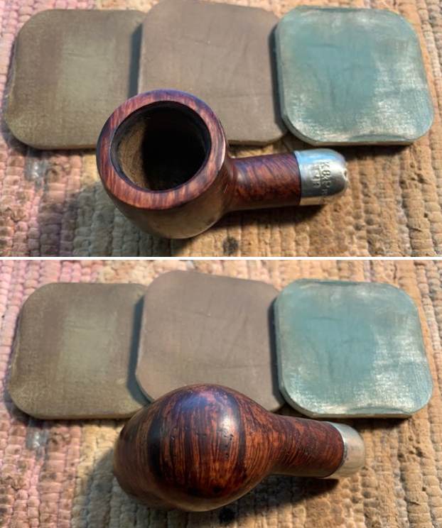 I knew that I was dealing with a Republic Era pipe made between 1950-1989. The K&P mark on the nickel band ties to Kapp & Peterson brings the date to the time between 1950-1964. It was a smooth Straight billiard with a unique shape and chamber beneath the bottom of the bowl. The finish was stained with a combination of rich reddish brown stains. Now it was time to work on the pipe.