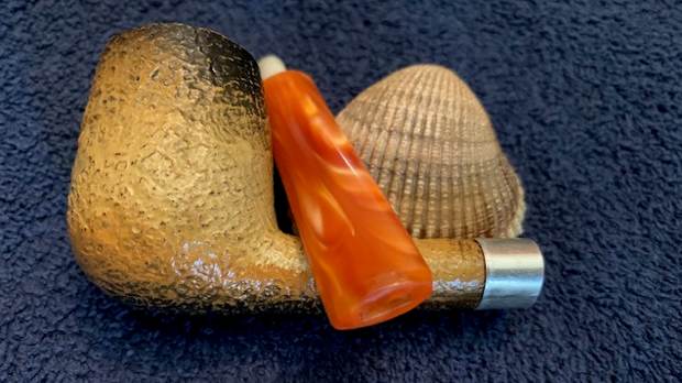 It’s presented in a sandblasted, virgin finish with darkened portions along the rim and shank end meant to emulate the look of a weathered patina. Erik designed these pipes with patinating in mind, meant to emulate the look of meerschaum…