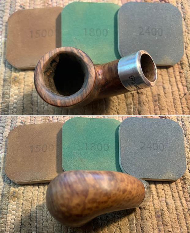 I took photos of the rim top and the stem to show their condition. The top and edges showed some damage and was out of round and had darkening. The stem had oxidation though there was not any tooth marks of damage on the surface.