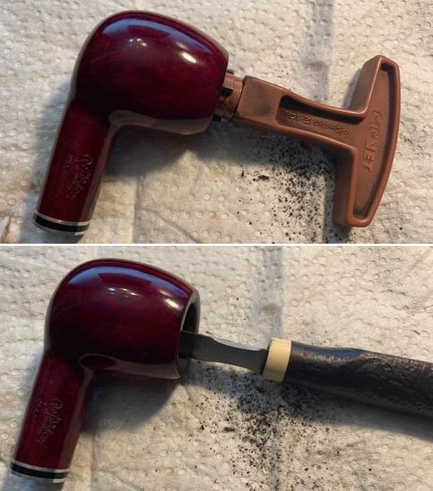 I reamed the bowl with a PipNet pipe reamer and removed the cake from the walls. I followed up with a Savinelli Fitsall pipe knife to remove the remnants of the cake still in the bowl. I sanded the bowl walls with 220 grit sandpaper wrapped around a piece of dowel to smooth out the surface.
