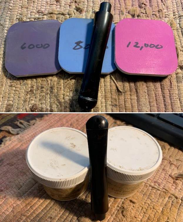 I topped the bowl with 220 grit sandpaper on a topping board to remove the marks and damage on the rim top. I carefully cleaned up some of the darkening and burn marks on the front rim top and edges. I used a folded piece of 220 grit sandpaper to give the inner edge of the bowl a slight bevel to minimize the darkening and damage and blend it into the surrounding briar.