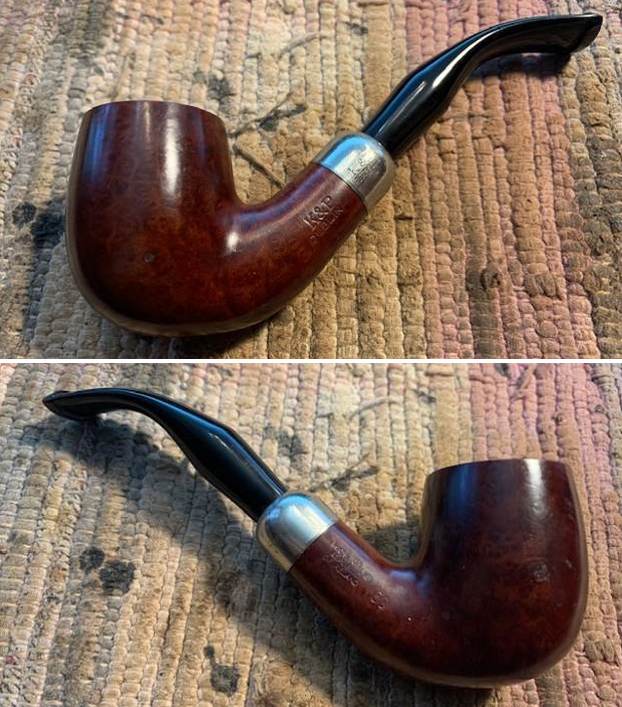 This is another pipe that I have taken out of my personal collection as I just do not use it too much. It is a classic Peterson’s Bent Billiard shaped pipe with some nice grain around the bowl and a nickel ferrule. It is another pipe that I smoked solely Virginia tobaccos in so it is very clean. The airway in the shank and the mortise were quite clean. The smooth rim top and edges were in excellent condition. The smooth finish was very clean but dull and quite lifeless. There were a few small fills the bowl sides.The grain is mixed but still quite nice around the bowl and shank. The stamping on the shank is clear and readable. The left side is stamped K & P[over] Dublin. On the right side it was stamped Made in the Republic of Ireland (3 lines) followed by the shape number 69. The nickel ferrule is dull but stamped K&P [over] Petersons. The original Fishtail stem was quite clean with no oxidation or tooth marks. I took some photos of the pipe before I started my work on it. I took close up photos of the bowl and the stem. You can see the light cake in the bowl and the clean rim top and edges. The fishtail stem surface was clean and free of tooth marks or chatter on both sides. I took  photos of the stamping on the sides of the shank and ferrule. It is clear and readable as noted above. I removed the stem from the shank and took a photo to give a sense of the proportions of the pipe. It is really quite nice looking. I am including the information from Pipedia’s article on Peterson pipes. It is a great read in terms of the history of the brand (https://pipedia.org/wiki/Peterson). I have included a bit of the pertinent history here.