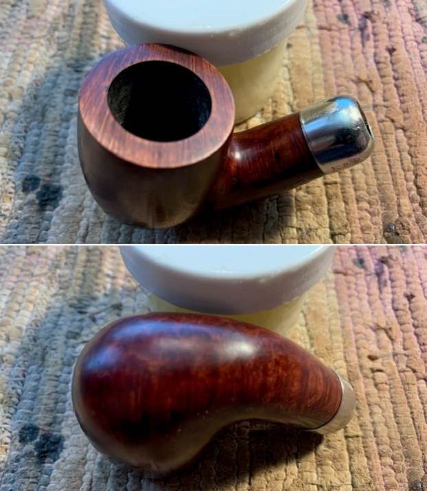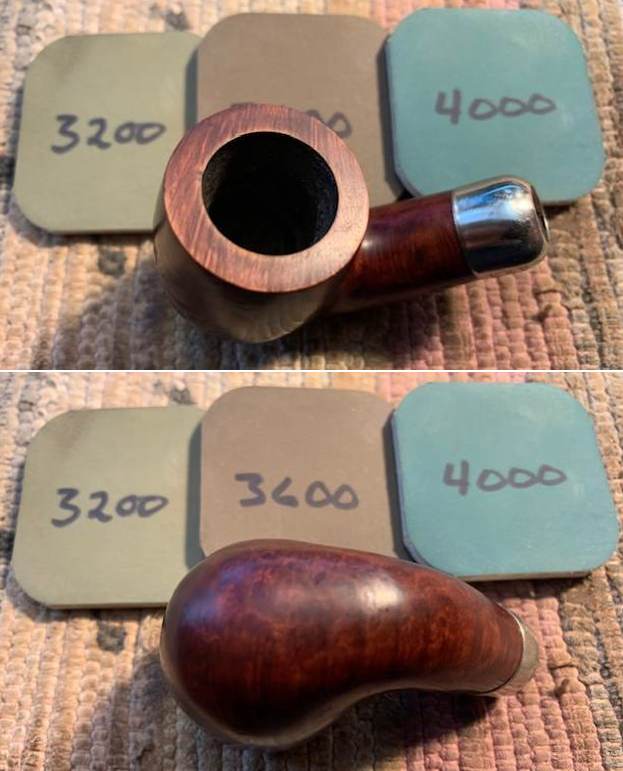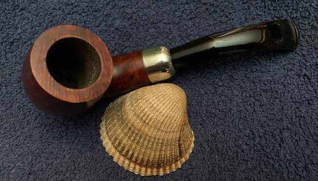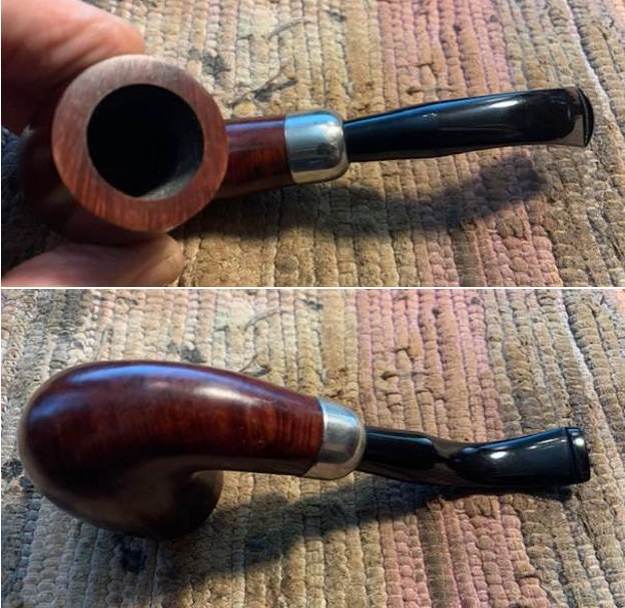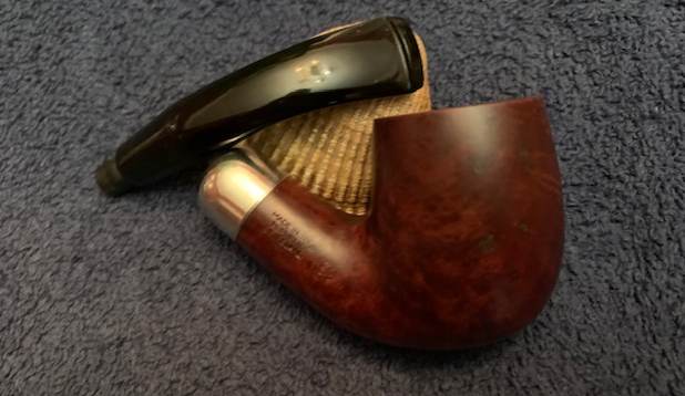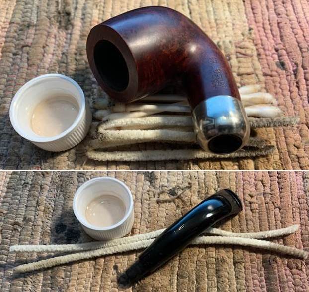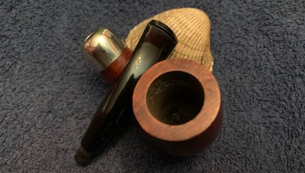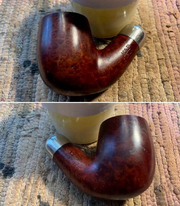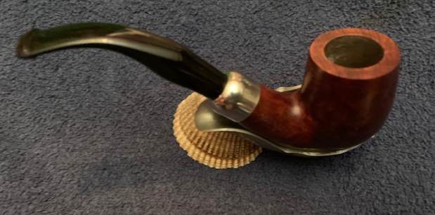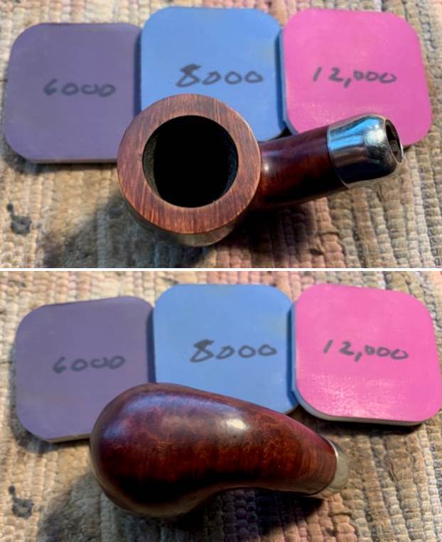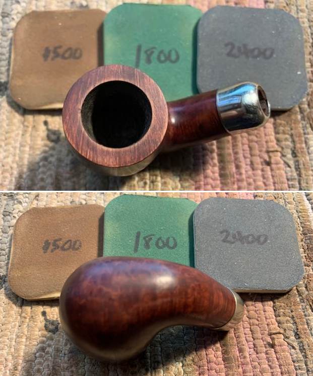 I reamed the bowl with a Savinelli Fitsall Pipe Knife. I sanded the walls on the bowl with a piece of 220 grit sandpaper wrapped around a piece of dowel to take the walls back to smooth once again.I cleaned out the sump, the shank and the airway in the stem and shank with pipe cleaners, cotton swabs and isopropyl alcohol. The pipe was clean and it smelled significantly better.I polished the rim top and edges with micromesh sanding pads – dry sanding with 1500-12000 grit pads to raise a shine. I wiped it down with a damp cotton pad to wipe off the debris after each sanding pad. I polished the nickel ferrule with a  jeweler’s cloth. The cloth is impregnated with polish that not only raises a shine but protects the metal.  I worked some Before & After Restoration Balm into the surface of the briar with my fingertips. It works to clean, enliven and protect the briar. I let it sit for 15 minutes then buffed it off with a soft cloth and raised the shine. The bowl looks great at this point.   The stem was in such good condition that I wiped it down with some Obsidian Oil to polish and protect it. It is a great looking fishtail stem with a faux military mount.I put the stem back on the Republic Era Peterson’s Made K&P Dublin 69 Bent Billiard and buffed the pipe with Blue Diamond on the buffing wheel. I polished the briar and the vulcanite of the stem until there was a rich shine. This classic Peterson’s shape and finish really highlights a proportionally well carved pipe. Once I buffed the pipe the briar came alive and popped with polishing. The black vulcanite stem has a rich glow. This K&P Dublin 69 Bent Billiard fits well in the hand and sits right in the mouth. Have a look at it with the photos below. The dimensions are Length: 5 ½ inches, Height: 1 ¾ inches, Outside diameter of the bowl: 1 ¼  inch, Chamber diameter: ¾ of and inch. The weight of the pipe is 1.59 ounces/45 grams. It was one I chose for my own collection and enjoyed, but I am happy to pass it on to the next pipe man or woman. This beauty will be going on the rebornpipes online store in the Irish Pipemakers Section. If you are interested let me know. Thanks for walking through the restoration with me as it was a pleasure to work on.