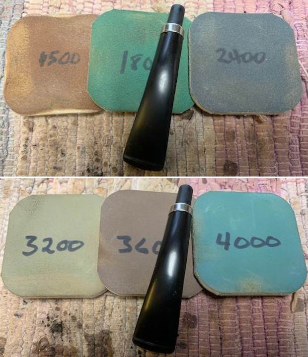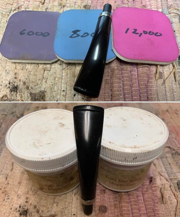I polished the stem with micromesh sanding pads – dry sanding with 1500-12000 grit sanding pads. I wiped the stem down after each sanding pad with a cloth impregnated with Obsidian Oil. The oil both preserves the rubber and also provides some needed friction for the micromesh pads. I polished it with Before & After Fine & Extra Fine Polish. I rubbed it down a final time with the oil and set it aside.