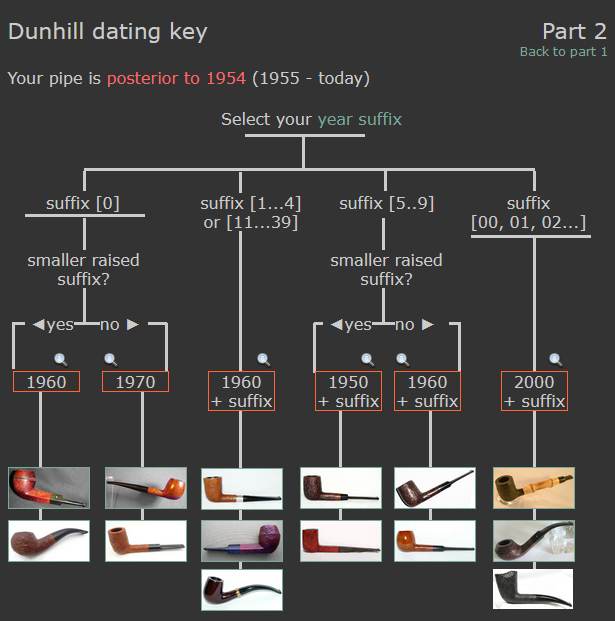 I followed the link following the “Your pipe was crafted between 1921 and 1954. Narrow down your dating”. That took me to Page 2 of the dating key (http://pipephil.eu/logos/en/dunhill/cledat-en1b.html). The first column on the left led me to the section on 1…4 where the directive of dating the pipe is spelled out as follows: 1950 + suffix which gives the pipe a date of 1954.