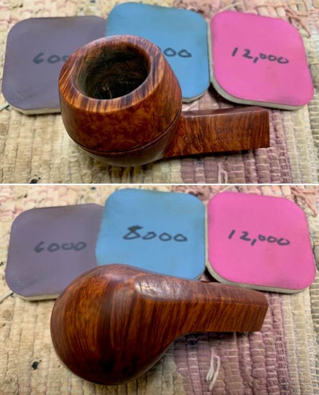 I polished the vulcanite with micromesh sanding pads – 1500-12000 grit pads. I wiped it down with Obsidian Oil after each sanding pad. I used Before & After Pipe Polish – both Fine and Extra Fine to further polish the stem.