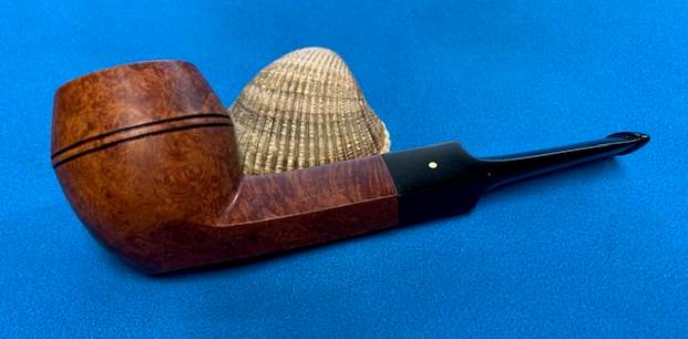 Dunhill introduced its third major finish, the Root finish, in 1931. Corsican mountain briar is characteristically beautifully grained and the Root was made exclusively from that briar into the 1960s. The pipe was finished with a light natural stain to allow the beauty of the graining to show through. Although always available with a traditional black vulcanite bit, the Root was introduced in either 1930 or more likely 1931 and fitted with a marble brown dark and light grained vulcanite bit that has since become known as the ‘bowling ball’ bit because of the similarity in appearance between the bit’s finish and that of some bowling balls of the time. With the war, however, the bowling ball bit was dropped from production. Through 1954 (and after) the Root pipe nomenclature (including shape numbers) was identical to that of the Bruyere except that instead of the “A” of the Bruyere, the Root was stamped with an “R”. In 1952 when the finish rather then LONDON was placed under DUNHILL, ROOT BRIAR rather then BRUYERE was used for the Root. Loring, J. C., The Dunhill Briar Pipe, The Patent Years and After (self-published, Chicago, 1998).