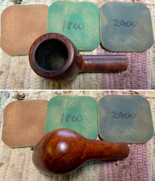 I set the bowl aside and turned to address the stem issues. I “painted” the surface of the stem with the flame of a Bic lighter. The heat lifted the tooth marks significantly. I filled in the remaining spots with clear CA glue. Once the repairs cured I flattened the with a small file then sanded them with 220 grit sandpaper to blend them into the surface of the stem. I started the polishing with a 400 grit wet dry sandpaper.