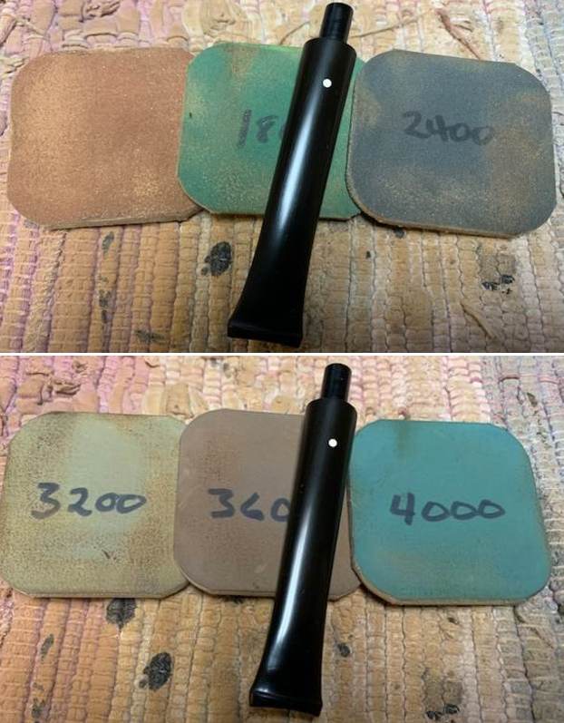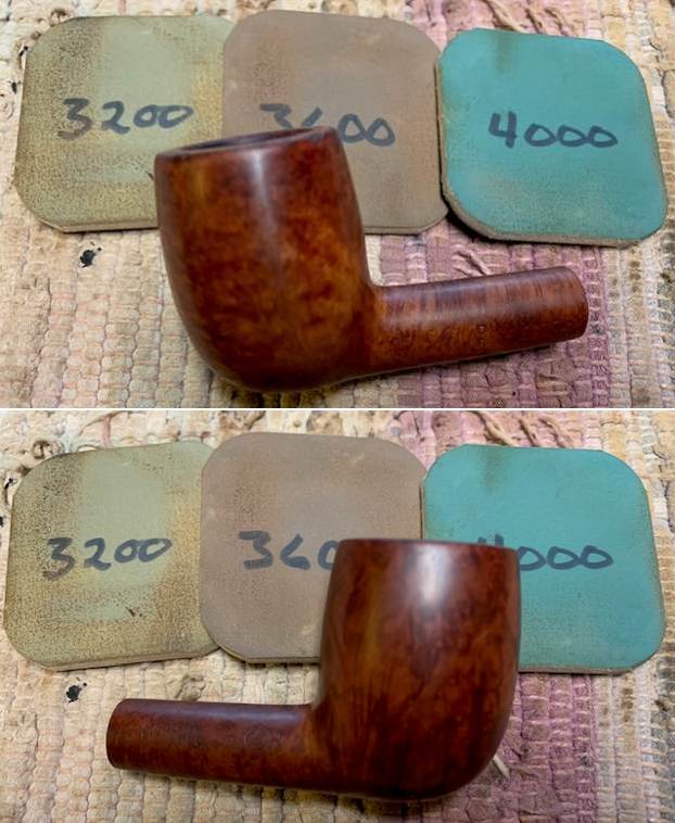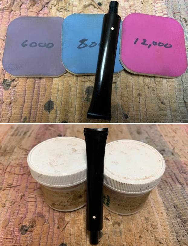 I polished the vulcanite with micromesh sanding pads – 1500-12000 grit pads. I wiped it down with Obsidian Oil after each sanding pad. I used Before & After Pipe Polish – both Fine and Extra Fine to further polish the stem.