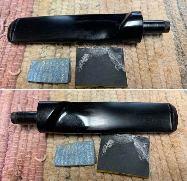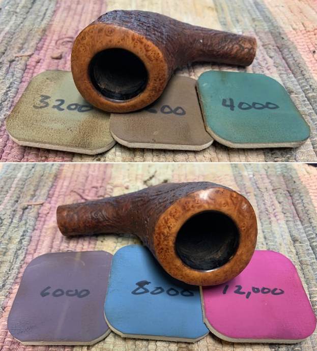 I polished the rim top with micromesh sanding pads – wet sanding with 1500-12000 grit pads. I wiped the bowl down after each pad with a damp cloth. The grain really began to pop and stand out on the polished briar.
