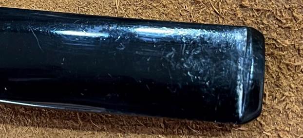 I decided to address the damage to the inner edge of the rim. I used a wooden ball and a piece of 220 grit sand paper to give the inner edge a slight bevel to take care of the damage and burn marks. I cleaned it up lightly with a folded piece of 220 grit to smooth out the notches from the reaming work done before it arrived here. I was able to minimize the damaged area.