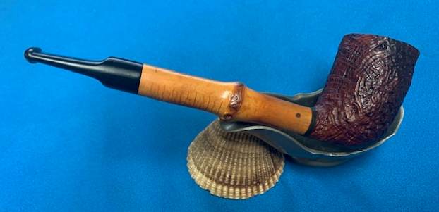 The next pipe on the table is one that was sent to me for a restoration. I am not taking on too many more pipes from outside Canada but the shape and finish of this one caught my eye. It is a Savinelli Autograph 4 with an unusual shape and a great sandblast finish. It is dirty but still very eye catching. It is stamped on the underside of the shank and reads Savinelli [over] Autograph [over] 4. The shank is round but has a flat bottom that allows the pipe to be a sitter. The bowl had been partially reamed and the top half had scraped away some briar on the inner edge of the bowl. The bottom half was very full of a thick cake that had not been touched with the reamer. The pipe smelled of old tobacco but did not seem to be a heavy aromatic. The shank was dirty with oils and tars. The acrylic stem is almost certain a replacement. It does not have the characteristic autograph/signature on the side of the saddle though it is very well made and the fit to the shank is perfect. There were light tooth marks and chatter in the surface on both sides. The button surface was clean but the slot had been filled in with debris leaving a very small airway. I am including the photos of the pipe that were sent by the person who is the steward of the pipe below. I think that you can see what attracted me to this one.