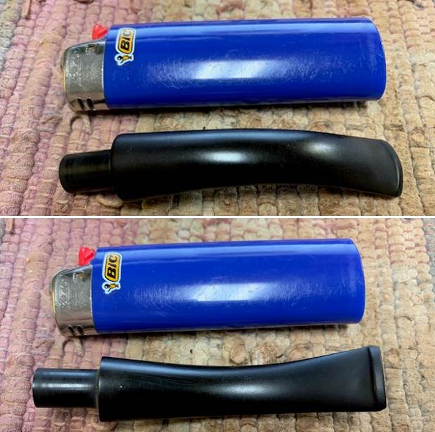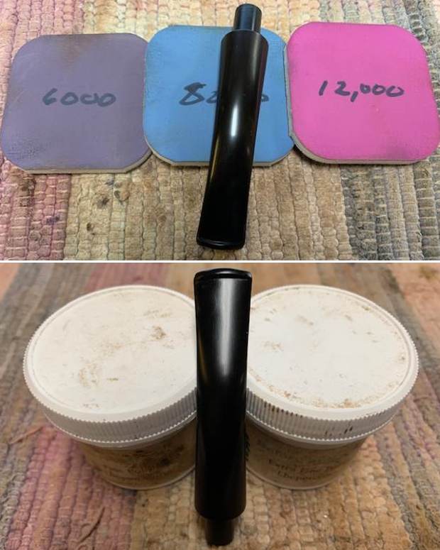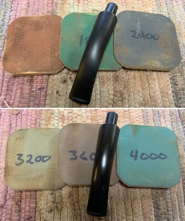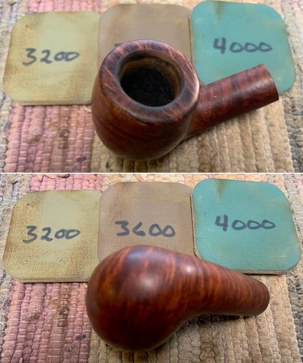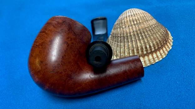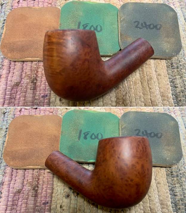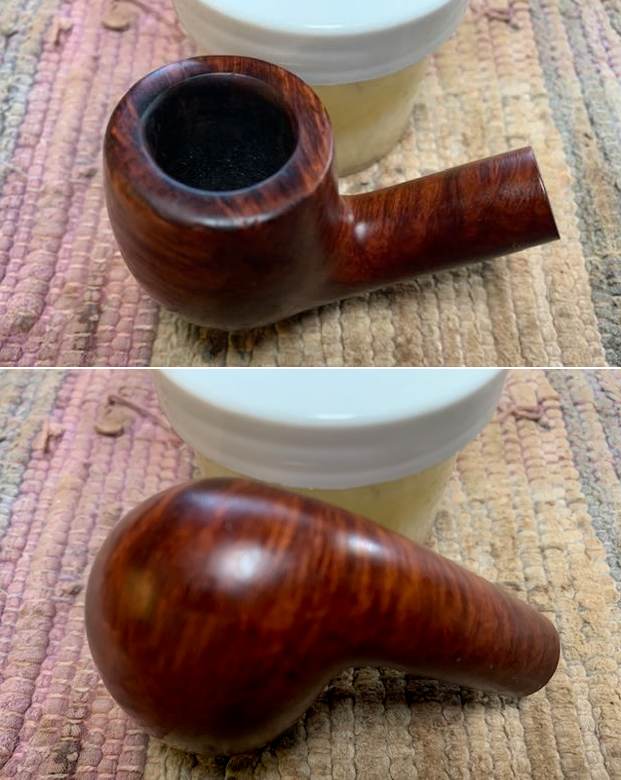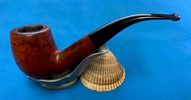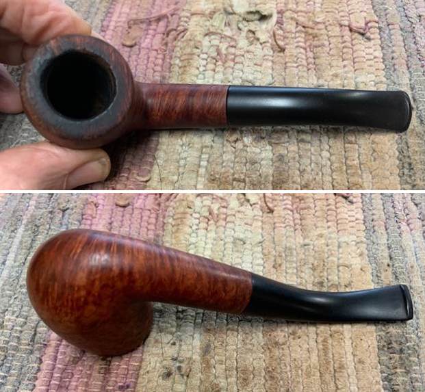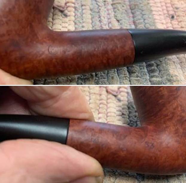 I have also included a chart from the site from Dunhill spelling out the Standard Pipe Finishes and giving short information and a timeline. I turned to work on the pipe itself. Jeff had done an amazing cleanup of the pipe. He reamed the cake with a PipNet reamer and cleaned up that with a Savinelli Fitsall Pipe Knife. He scrubbed the internals of the bowl and stem with alcohol, cotton swabs and pipe cleaners. He scrubbed the externals with undiluted Murphy’s Oil Soap and rinsed the bowl off with running water. He soaked the stem in Briarville’s Pipe stem Deoxidizer and once it had soaked rinsed it off with warm water to remove the residual solution. He dried it off and rubbed it down to remove any oxidation that was still on the stem. The pipe looked very good when I received it. I took a photo of the rim top to show the condition. You can see the clean bowl and the damage on the rim top and inner and outer edges. The replacement stem came out looking quite good. There are some scratches, tooth marks and chatter on both sides ahead of the button.   I took photos of the stamping on the sides of the shank. The stamping is faint in spots but still very readable. It reads as noted above. I removed the stem from the shank and took a photo of the pipe parts to show what I was working with. It is a nice looking pipe. I worked on both the inside and outside edge and top of the rim with a folded piece of 220 grit sandpaper to clean up the damage. It would take some work but it looked much better.I polished the cleaned up rim top and edges with micromesh sanding pads – dry sanding with 1500-12000 grit pads and wiping the bowl down with a damp cloth to remove the dust. The rim top came out looking very good. I rubbed the briar down with Before & After Restoration Balm. I worked it into the briar with my fingertips. The product works to clean, enliven and preserve the briar. I let it sit for 10 minutes then I buffed it with a cotton cloth to deepen the shine. The briar comes alive with the balm. I set the bowl aside and turned to address the stem issues. I “painted” the surface of the stem with the flame of a Bic lighter. The heat lifted the tooth marks significantly. I filled in the small remaining marks with clear CA glue. I flattened them out with a small file once they cured. I sanded them with 220 grit sandpaper to blend them into the surface of the stem. I started the polishing with a 600 grit wet dry sandpaper. I polished the vulcanite with micromesh sanding pads – 1500-12000 grit pads. I wiped it down with Obsidian Oil after each sanding pad. I used Before & After Pipe Polish – both Fine and Extra Fine to further polish the stem. This 1950 Dunhill London Root Briar 53 Bent Billiard with a replacement taper stem has a smooth Dunhill finish that has some great grain. The polished mix of brown stains highlights some great grain around the bowl and shank. The polished replacement vulcanite taper stem adds to the mix. I put the stem back on the bowl and buffed the pipe with Blue Diamond on the buffing wheel being careful to not buff the stamping. I gave the bowl and the stem multiple coats of carnauba wax on the buffing wheel and followed that by buffing it with a clean buffing pad. I hand buffed the pipe with a microfiber cloth to deepen the shine. The finished 1950 Dunhill London 3R 53 Bent Billiard is quite nice and feels great in the hand. Give the finished pipe a look in the photos below. The dimensions of the pipe are Length: 5 ½ inches, Height: 1 ¾ inches, Outside diameter of the bowl: 1 1/8 inch, Chamber diameter: ¾ of an inch. The weight of the pipe is 1.45 ounces/41 grams. Thanks for walking through the restoration with me as I worked over another beautiful pipe. If you are interested in adding it to your collection I will be adding it to the British Pipe Makers Section of the rebornpipes store. Thanks for your time.