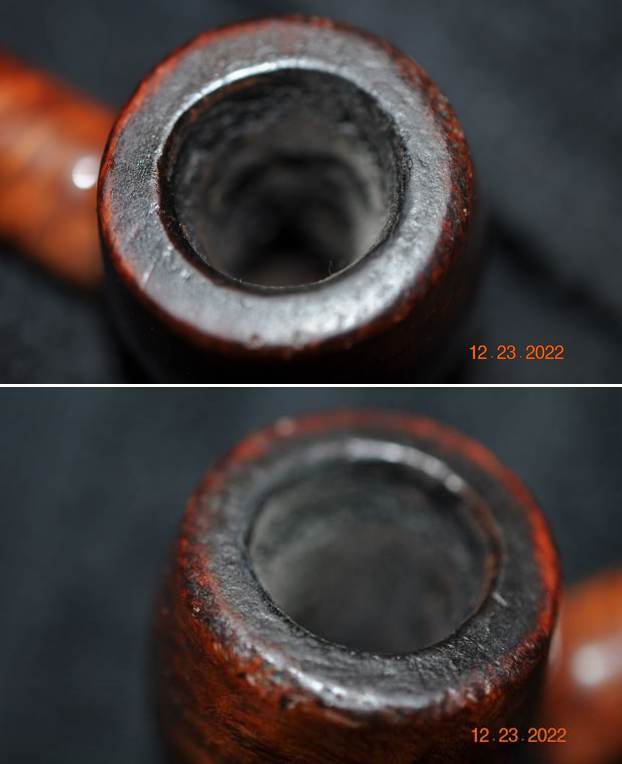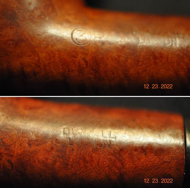 The next pipe on the table is another one that came to us from a group of pipes that Jeff and I purchased on 11/10/2022 from Copenhagen, Denmark. It is another Dunhill smooth finish pipe that is in rough but workable condition. On the left side it is stamped with the shape number 4R followed by Dunhill [over] London. On the right side it is stamped Made in [over] England followed by the date number superscript 0 after the D in England. Underneath that it reads Pat. No. 417574/34. After that it is stamped with a 3 in a circle [followed by] R for Root Briar.  The stamping is faint but readable as noted above. The pipe has an brown coloured stain with some amazing grain that the shape follows well. The finish extremely was dirty. The bowl had a moderate cake and there was an overflow lava and darkening and damage on the rim top and both the inner and outer edges. The taper stem was in decent condition and was oxidized, calcified and had tooth marks and chatter ahead of the button. The stem was also missing a white spot so it is a replacement stem. Jeff took photos of the pipe to show what it looked like before he started working on it. He took photos of the bowl and rim top to show their condition and of the stem to show the condition of both sides of the stem. The photos of the sides and heel of the bowl show beautiful cross and birdseye grain and the Root Briar coloured finish on the pipe. Even under the grime it is a real beauty. The stamping on the sides of the shank are shown in the photos below. It is faint but readable. It reads as noted and explained above. Jeff captured the detail in the photos below. One of the first things I like to do is to unpack the stamping and understand each element in it. I turned to Pipephil’s helpful site (http://pipephil.eu/logos/en/dunhill/bruyere1.html). There was no pipe with the same Dunhill [over] London stamping on the Root Briar page but I can still work with the stamping. It can be interpreted as follows: The 53 stamp is the shape for a Billiard. The London stamp appears at times under Dunhill on older Root Briar and Bruyere pipes. The 0 following the D of England gives the date the pipe. The Circle 3 R refers to the size of the pipe being a Group 3 and the R is for the Root Briar designation.