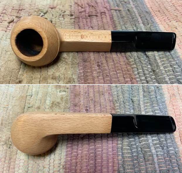 The next pair of pipes were purchased on 11/10/22 as part of a group of pipes from a fellow in Copenhagen, Denmark. They were both smoked, though the briar one was more heavily used. The lighter Beechwood pipe had been smoked and had a light cake and some darkening around the inner edge of the rim top. The Beechwood pipe is stamped on the left underside of the shank and reads Kyrringe [over] Made in Denmark [over] No. 1. The darker briar pipe had a thick cake and a lava overflow on the rim top. It was stamped on the left underside of the shank and read Stanwell [over] Made in Denmark [over] No. 1. The finish on the Beechwood one showed some nice grain around the bowl and shank and though it was a little dirty it was a nice looking pipe. The Briar one had some rich grain around the bowl and shank and was dirty. Both stems were black acrylic saddle stems. Both have light tooth marks and chatter on both sides of the stem ahead of the button. The Briar one had the Stanwell Crown S on the left side of the saddle stem while the Beechwood had nothing on the stem side. Jeff took photos of the pipes before he started his clean up work.