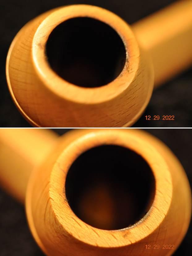 I took photos of the rim top and the stem to show their condition once it arrived in Canada. Jeff was able to clean up the Beechwood pipe and it looked very good. He also was able to remove the thick cake and lava overflow that was shown in the rim and bowl photos of the Briar bowl above. Both pipes cleaned up very well but had some damage on the inner edge of the rim. The stem looked better on both pipes as can be seen in the photos below. There were tooth marks and chatter on both sides near the button on both pipes.