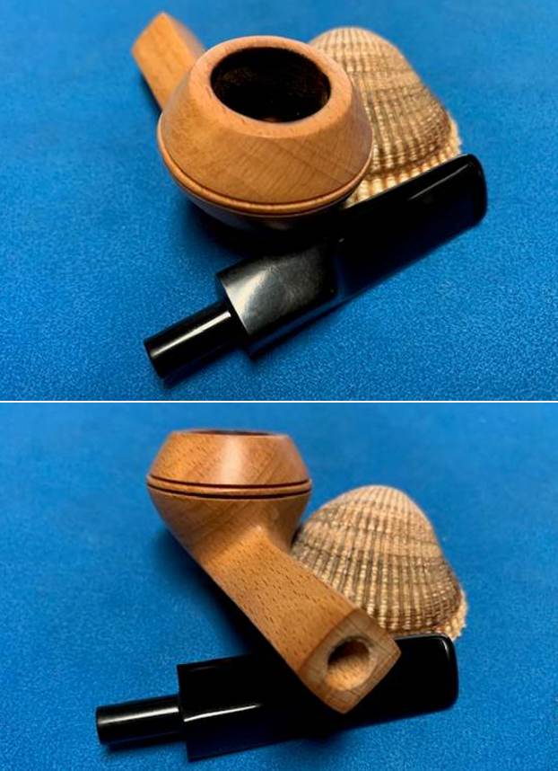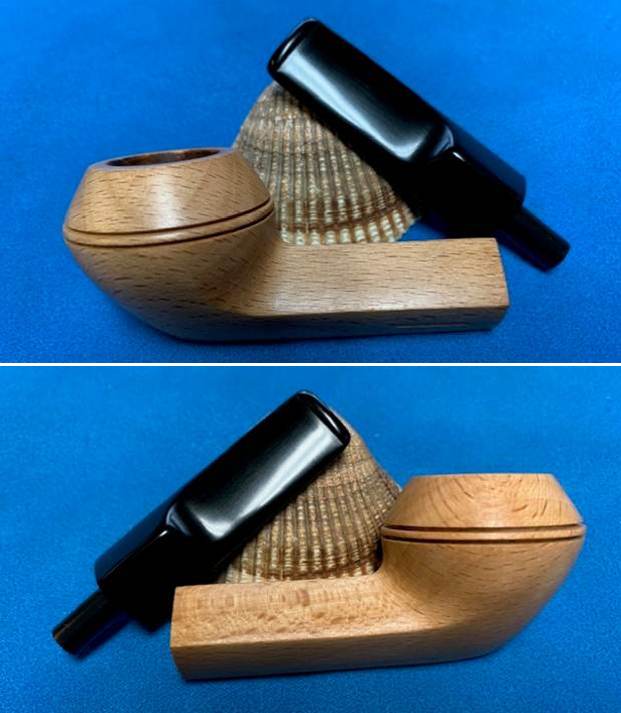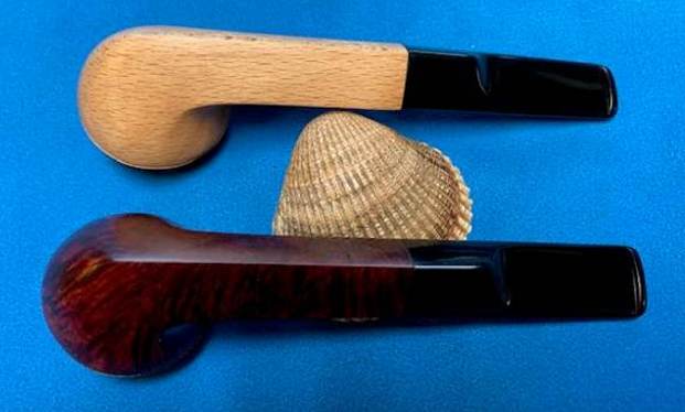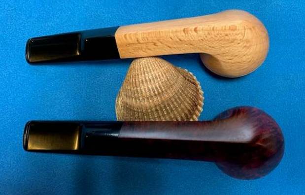 The photos of the sides and heel of the bowls show beautiful grain around the bowl and shank sides. The twin rings on both are very nicely done and show no damage. The light natural colour of the Beechwood and the reddish stain on the briar adds depth finish on the pipes and makes the grain really stand out. They are a beautiful pair of pipes.