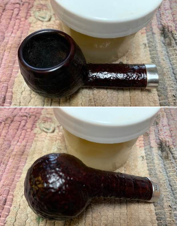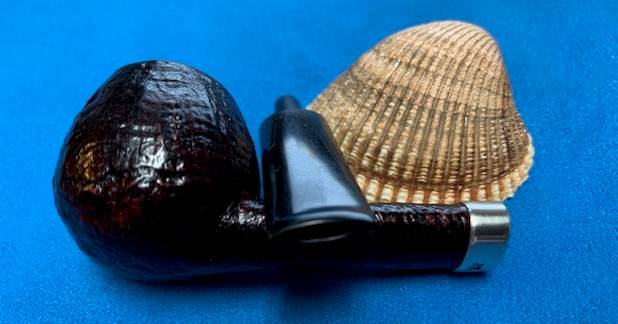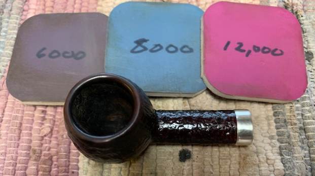 Jeff cleaned up the pipe for me. He reamed the bowl with a PipNet pipe reamer and cleaned it up with a Savinelli Fitsall Pipe Knife. He scrubbed the exterior with Murphy’s Oil Soap and a tooth brush to clean off the grime off the finish and the overflow of lava on the rim top. The cleaning had removed the debris on the rim top. He cleaned up the internals of the shank, mortise and stem with pipe cleaners, cotton swabs and alcohol to remove all of the oils and tars in the pipe. He soaked the stem in Before & After Deoxidizer and was able to remove much of the oxidation, calcification. When it arrived here in Vancouver it was a clean pipe and I knew what I had to work with. I took photos of it before I started my part of the restoration. I took a photo of the rim top and the stem to show their condition once it arrived in Canada. Jeff was able to clean up the cake and the lava overflow that was shown in the rim and bowl photos above. The rim top and the inner edge of the bowl showed some damage to the inner edge and some darkening on the rim top. He was also able to get rid of the grime and grit in the surface of the briar. The stem looked better, though there were tooth marks and chatter on both sides near the button. I took a photo of the stamping on the underside of the shank and the Sterling Silver band. It reads as noted above.I removed the stem from the shank and took a photo of the parts to give a sense of what the pipe looks like. I started my work on the bowl polishing the smooth rim top with micromesh sanding pads – dry sanding with 1500-12000 grit pads. I wiped the briar down after each pad. I rubbed the bowl and shank down with Before & After Restoration Balm to deep clean them. The product works to clean, enliven and protect the briar. I worked it in with my fingers to get it into the briar. I let it sit for 10 minutes then I wiped it off and buffed it with a soft cloth. The briar really began to have a rich shine. I took some photos of the bowl at this point to mark the progress in the restoration. It is a beautiful bowl. I used a jewelers cloth to polish the silver band on the pipe. I was able to remove the tarnish and marks on the silver and raise the shine. I set aside the bowl and turned my attention to the damage on the stem. I sanded the light tooth marks and chatter on the stem smooth with 220 grit sandpaper and started polishing it with 400 grit wet dry sandpaper. I polished the stem with micromesh sanding pads – dry sanding with 1500-12000 grit pads. I wiped the stem down after each pad with a damp cloth to remove the sanding dust. I gave it a further polish with Before & After Stem Polish – both Fine and Extra Fine. I finished by wiping the stem down with a final coat of Obsidian Oil and set it aside to dry. I put the stem back on the S. Bang Black Sandblast Oval Shank Apple and took the pipe to the buffer. I buffed the bowl and stem with Blue Diamond to polish the briar and the vulcanite. Blue Diamond does a great job on the smaller scratches that remain in both. I gave the bowl and the stem several coats of carnauba wax and buffed the pipe with a clean buffing pad to raise the shine. I hand buffed it with a microfiber cloth to deepen the shine. Considering the mess the pipe was when we received it I am amazed at how well it turned out. The finished pipe is shown in the photos below. This is a beautiful S. Bang Sandblast Apple – the vulcanite taper stem and rim top and sandblast finish combine to give the pipe a great look. The polished black, vulcanite stem looks really good with the rich grain standing out on the bowl and shank. The dimensions of the pipe are Length: 4 ½ inches, Height: 1 ¼ inches, Outside diameter of the bowl: 1 inch, Chamber diameter: 7/8 of an inch. The weight of the pipe is .81 ounces/23 grams. This beautiful little S.Bang will be staying with me for awhile. Thanks for walking through the restoration with me on this beauty!
