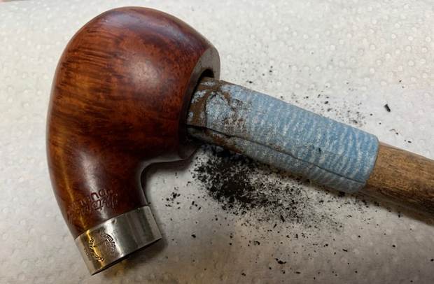I reamed out the light cake in the bowl with a PipNet pipe reamer. I cleaned up the reaming with a Savinelli Pipe Knife and finished by sanding the bowl walls with a piece of dowel wrapped with 220 grit sandpaper.