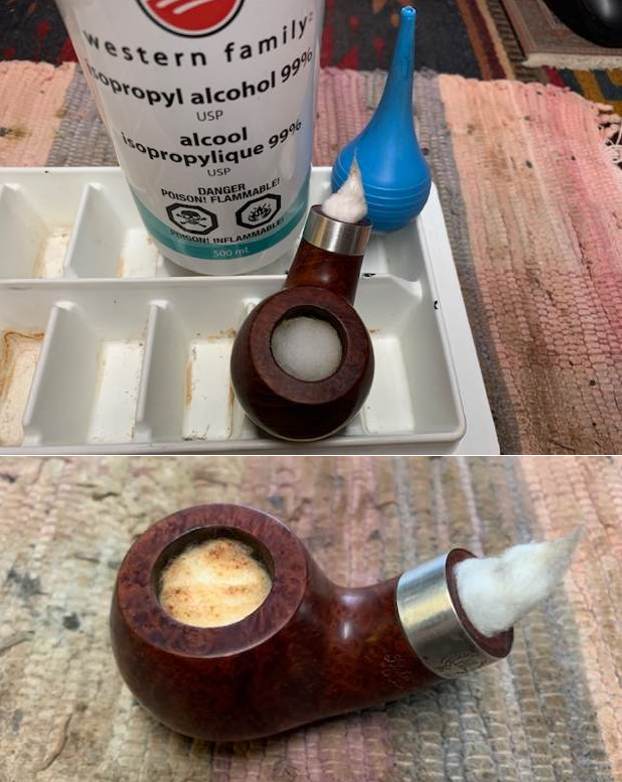 To deghost the pipe of the heavy Latakia smells I stuffed bowl with cotton bolls and used a twisted cotton boll in the shank. I filled the bowl with alcohol using an ear syringe to place the alcohol directly in the bowl. I set it aside to let it do its work drawing out the tars and oils from the walls of the bowl and the shank. I let it sit overnight and then removed the dirty and oily cotton and debris that had accumulated. I ran a pipe cleaner through the shank and removed any remnants of debris. The pipe smelled significantly better.