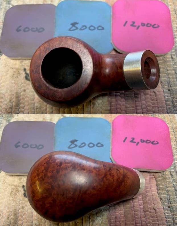 I polished the bowl with micromesh sanding pads – dry sanding with 1500-12000 grit pads. I wiped the bowl down with a damp cloth after each sanding pad. It really began to take on a shine. It is a beautiful piece of briar.