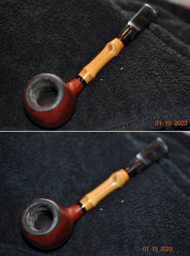 This rainy evening here in Vancouver I decided to work on was another one that was purchased on 11/14/2022 in a lot of pipes that came to us from Copenhagen, Denmark It included a group of Stanwell Bamboo pipe that are quite beautiful, combining a briar bowl, a bamboo shank and a an vulcanite stem. The grain around the bowl and shank has a mix of straight and flame grain. The pipe is stamped on the left side of the bamboo and reads STANWELL. The pipe was a well used pipe when Jeff received it. There was dust and grime ground into the finish. The mixture of brown stains highlights some beautiful grain under the dirt. The bowl was heavily caked and there was an overflow of lava on the rim top. The inner edge was hard to see clearly and the lava could easily be hiding damage. The stem is vulcanite and was lightly oxidized, dirty with light tooth marks and chatter on both sides ahead of the button and on the button itself. There is a brass/gold crown S logo inlaid on the left side of the taper stem. Jeff took photos of the pipe before he started his clean up work on it.