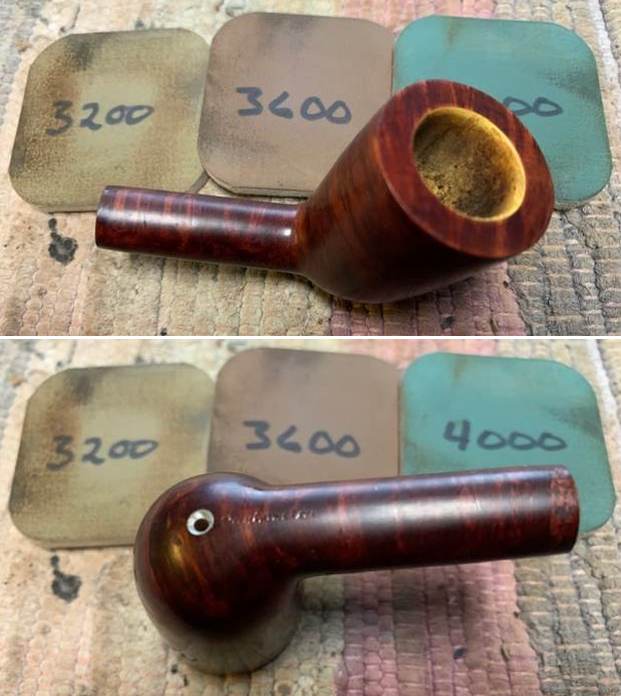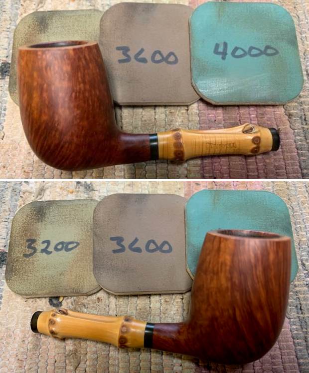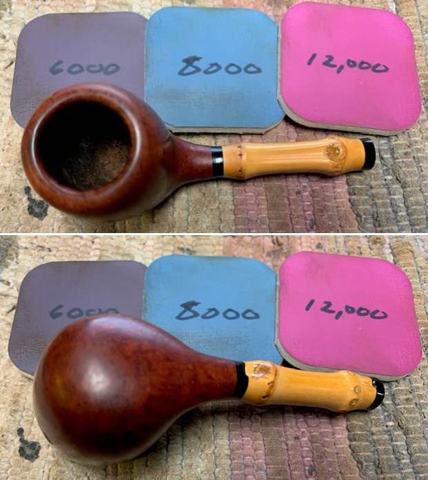 I polished the stem with micromesh sanding pads – 1500-12000 grit pads. I wiped it down with a damp cloth after each sanding pad. I used Before & After Pipe Polish – both Fine and Extra Fine to further polish the stem.