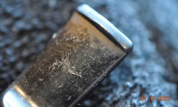 I filled in the marks that remained with clear CA glue. When the repairs cured I used a small file to reshape the button edge and flatten out the repairs. I sanded the repairs 220 grit sandpaper to blend them into the surface. I started the polishing process with 600 grit wet dry sandpaper.