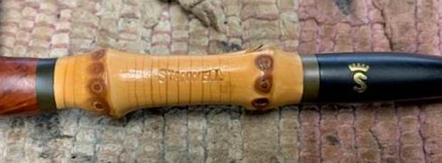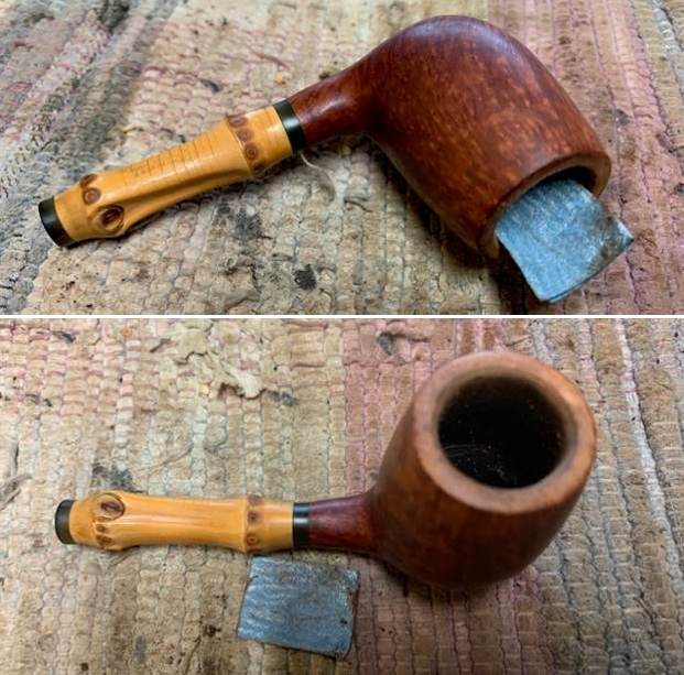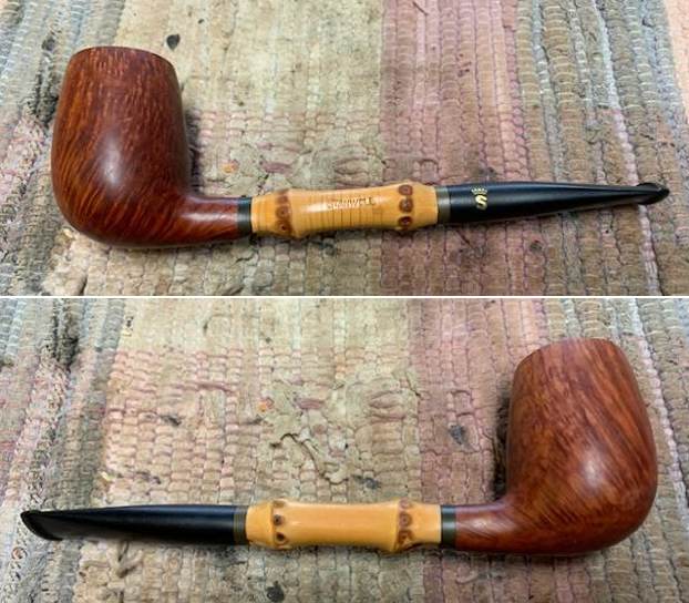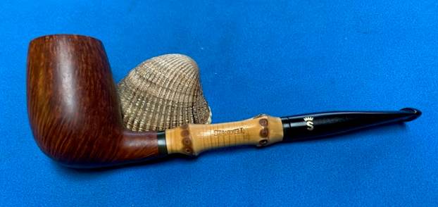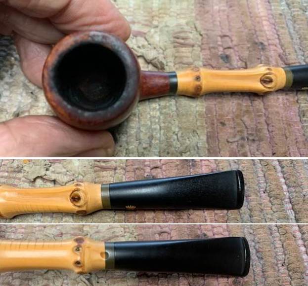 This rainy evening here in Vancouver I decided to work on was another one that was purchased on 11/14/2022 in a lot of pipes that came to us from Copenhagen, Denmark It included a group of Stanwell Bamboo pipe that are quite beautiful, combining a briar bowl, a bamboo shank and a an acrylic stem. The grain around the bowl and shank has a mix of straight and flame grain. The pipe is stamped on the left side of the bamboo and reads STANWELL. The pipe was a well used pipe when Jeff received it. There was dust and grime ground into the finish. The mixture of brown stains highlights some beautiful grain under the dirt. The bowl was heavily caked and there was an overflow of lava on the rim top. The inner edge was hard to see clearly and the lava could easily be hiding damage. The stem is acrylic and was dirty with light tooth marks and chatter on both sides ahead of the button and on the button itself. There is a brass/gold crown S logo inlaid on the left side of the saddle stem. Jeff took photos of the pipe before he started his clean up work on it.