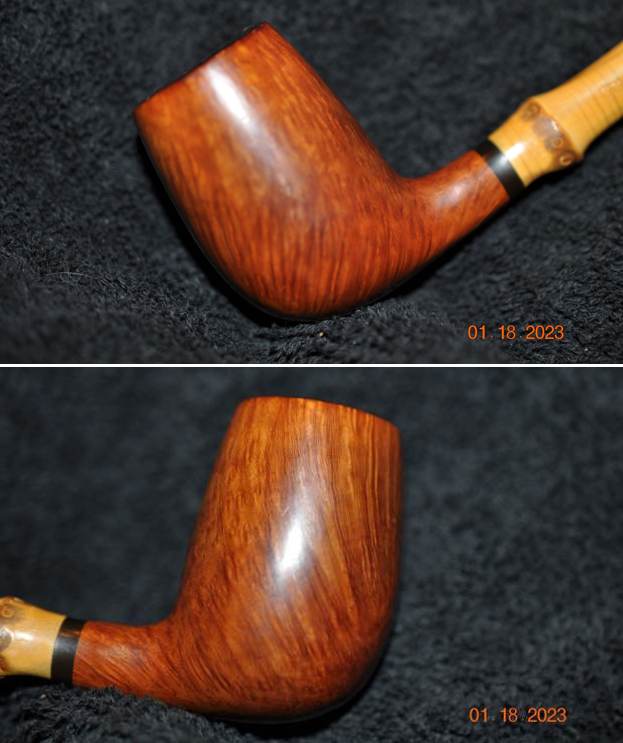 This Stanwell Bamboo Apple with an acrylic saddle stem is a great looking pipe now that it has been restored. The beautiful finish really highlights the grain and the polished finish is stunning. I put the stem back on the bowl and carefully buffed the pipe with Blue Diamond on the buffing wheel. I gave the bowl and the stem multiple coats of carnauba wax on the buffing wheel and followed that by buffing the entire pipe with a clean buffing pad. I hand buffed the pipe with a microfiber cloth to deepen the shine. The finished Stanwell Bamboo Apple fits nicely in the hand and feels great. Give the finished pipe a look in the photos below. The dimensions of the pipe are Length: 5 ½ inches, Height: 1 ½ inches, Outside diameter of the bowl: 1 1/8 inches, Chamber diameter: ¾ of an inch. The weight of the pipe is 34 grams / 1.20 ounces. I will be adding the pipe to the Danish Pipe Makers Section of the rebornpipes store. If you are interested in purchasing this pipe send me a message or an email. Thanks for reading this blog and my reflections on the pipe while I worked on it.