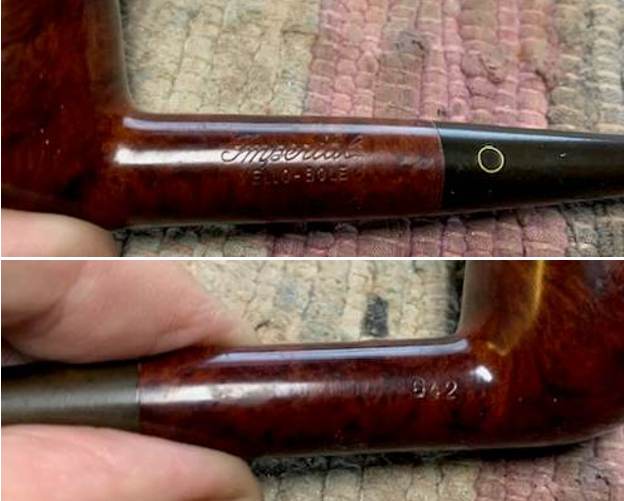 The next pipe on my table is the third and final pipe from threesome sent to for work from a fellow in Eastern Canada. This one is a smooth Dublin/Billiard. I found that it is stamped on the left side and read Imperial in script [over] Yello-Bole. On the right side it has the shape number 642 and on the heel it is stamped Carburetor next to the small aluminum tube in the heel. On the shank end where the stem and shank meet it is stamped Made in France. The bowl was hardly used and has a tube extending from the bottom of the bowl upward about 1/8 of an inch. Though there was some darkening in the bottom of the bowl the walls were still lined with the famous Yello-Bole honey coating and looked untouched. The bowl edges and rim top looked very good. The smooth finish was still shiny and new looking. The stem is probably vulcanite with a yellow circle on the left side of the taper and a huge chunk of vulcanite missing from the underside extending from the button forward about ½ inch. There were tooth marks and tooth chatter on both sides of the stem ahead of the button and on the surface. There was a Yello-Bole scoop stinger in the tenon that was also clean and undamaged. In looking at it I figured it would need a new stem. I took photos of the pipe before I started my work on it.