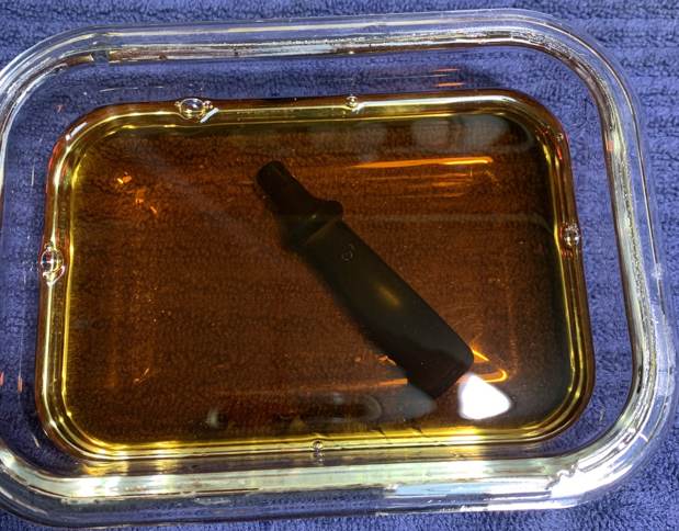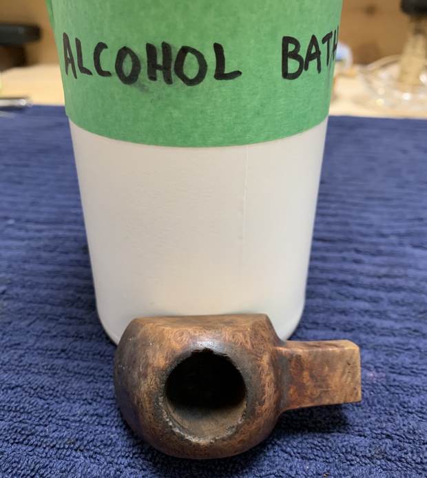 Because this pipe was so filthy, I decided to bypass the usual “ghosting” altogether, and go straight to a bath! I opted to soak the stummel in isopropyl alcohol overnight. This will usually remove the sort of goo, grunge, and ghosts I was faced with. Next day, I took it out of the bath and left it to dry.