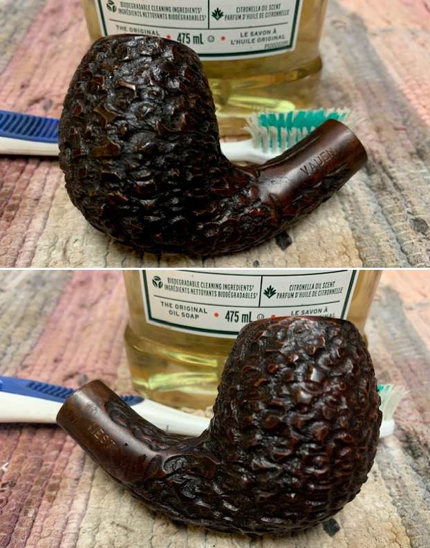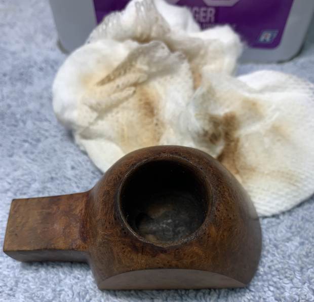 I then proceeded to clean out the insides of the shank with Q-tips, pipe cleaners, and lemon-infused isopropyl alcohol. It was fairly dirty, but not extraordinarily so. I used cotton rounds and some Murphy’s Oil Soap to scrub the outside of the stummel and a toothbrush with Murphy’s for the lava on the rim of the pipe. I followed that up by cleaning the insides with some dish soap and tube brushes.
