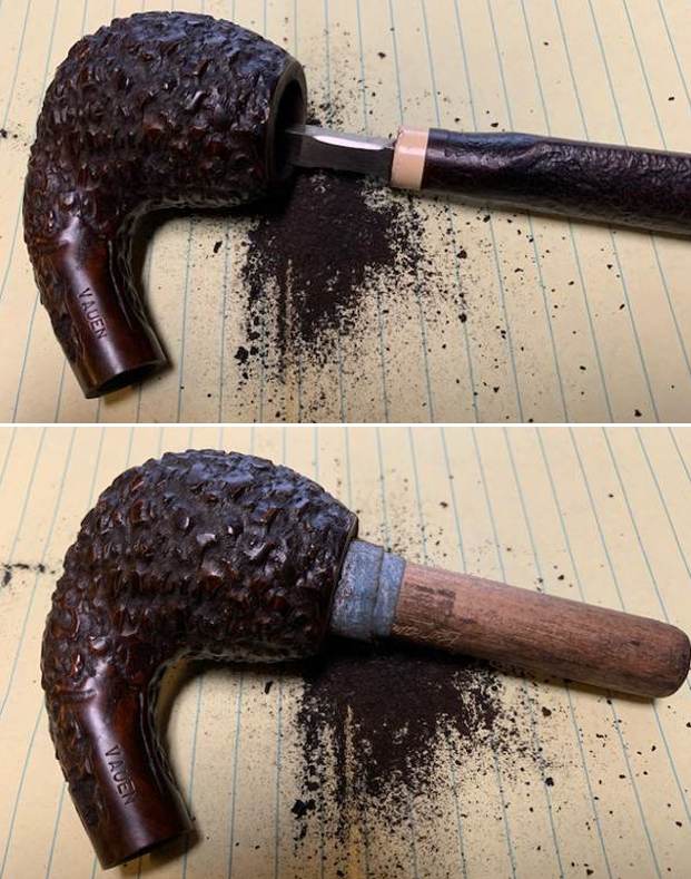 After all of that, it was time to work on the stummel. First, I reamed out the bowl. I used the KleenReem to remove the built-up cake and followed that with 220-grit sandpaper taped to a dowel to eliminate as much as I could. I took the chamber down to bare briar, as I wanted to ensure there were no hidden flaws in the wall. Fortunately, there were none. One thing to note is that this stem has an unusually wide draught hole and I’m not sure whether it was originally constructed that way, or if it was widened later. Either way, that (coupled with the crack in the shank) is why the stem’s tenon had that paper stuff on it – to ensure that the pipe fit together properly.