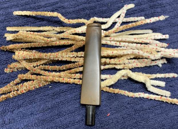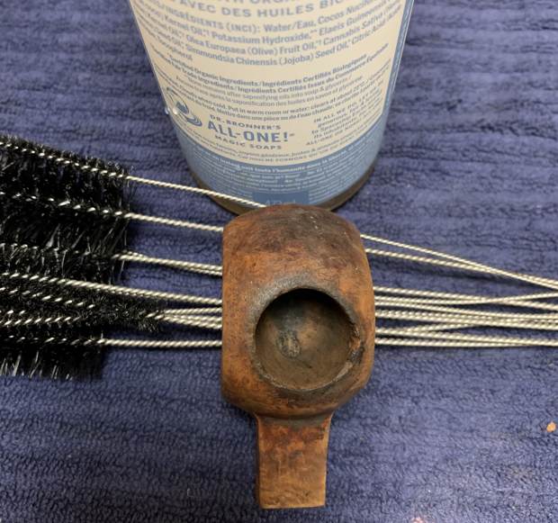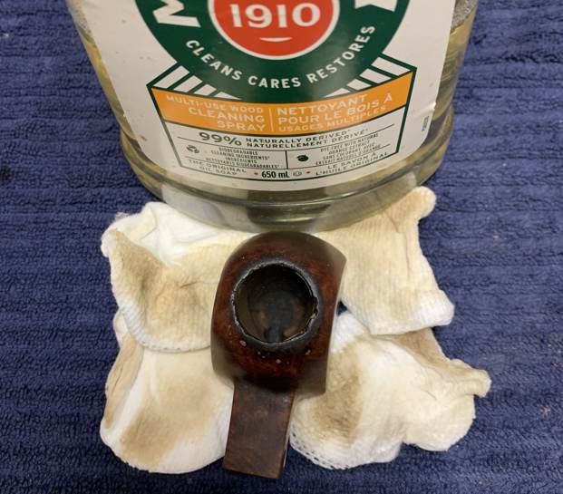 I wiped the outside down with Murphy’s Oil Soap on some cotton pads. I also took a BIC lighter and ‘painted’ the stem with its flame in order to lift the bite marks and dents. Then I cleaned out the inside with pipe cleaners and isopropyl alcohol.