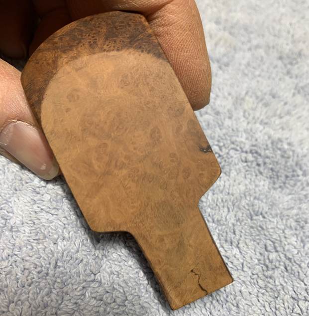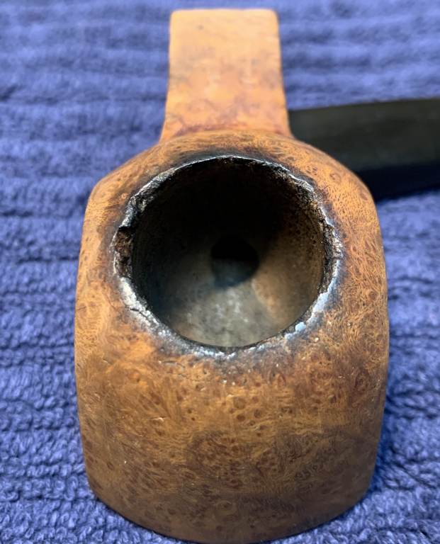 Next was to work on that meteor crater of a rim. I actually argued with myself for some time about this damaged rim. I seriously considered the idea of leaving the damage as it was (as part of the pipe’s history) because I was adamant about not changing the profile of the rim by sanding it. However, I felt that I couldn’t just leave the pipe as it was. It needed some help. I took some 600-grit sandpaper, wrapped it around my wooden sphere and gingerly sanded the rim. The circular shape and motion of the sphere gradually smoothed and returned the edge to a perfect circle. I think I managed to achieve a good balance between removing the damage but still keeping the original look.