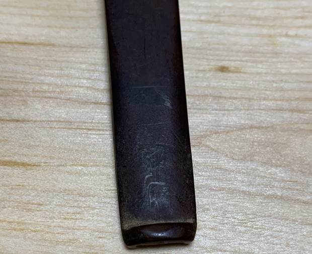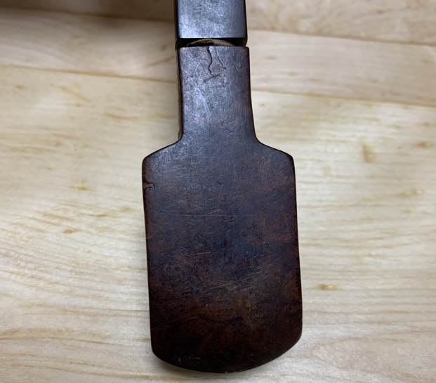I then moved on to the crack on the underside of the shank. The first step in dealing with this was to ensure that the crack would not continue to creep after I had repaired it. To that end, I took a micro-drill bit, inserted it in my Dremel, and very carefully drilled a hole right through the wall of the shank, into the mortise.