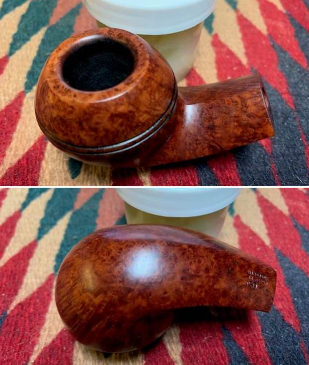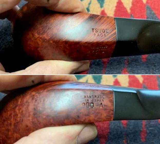 I then turned to the following link on Worthpoint, an online auction site that had a Kaga 950S on it (https://www.worthpoint.com/worthopedia/tsuge-kaga-950-handmade-japan-dark-400653938). It referred to a bent “Rhodesian” 950S shaped pipe, made by Tsuge Briar Pipe Company, Japan. It shows a “Kaga” pipe-line or grading stamp, with a beautiful “Dark” sandblasted finish, with an awesome grained, deep blast “Relief Grain”. This pipe is in excellent condition, it’s almost like a new pipe by Tsuge Briar Pipe Co.
