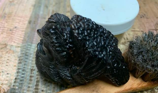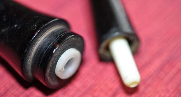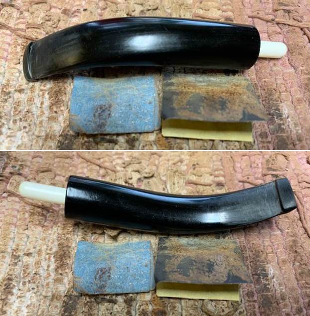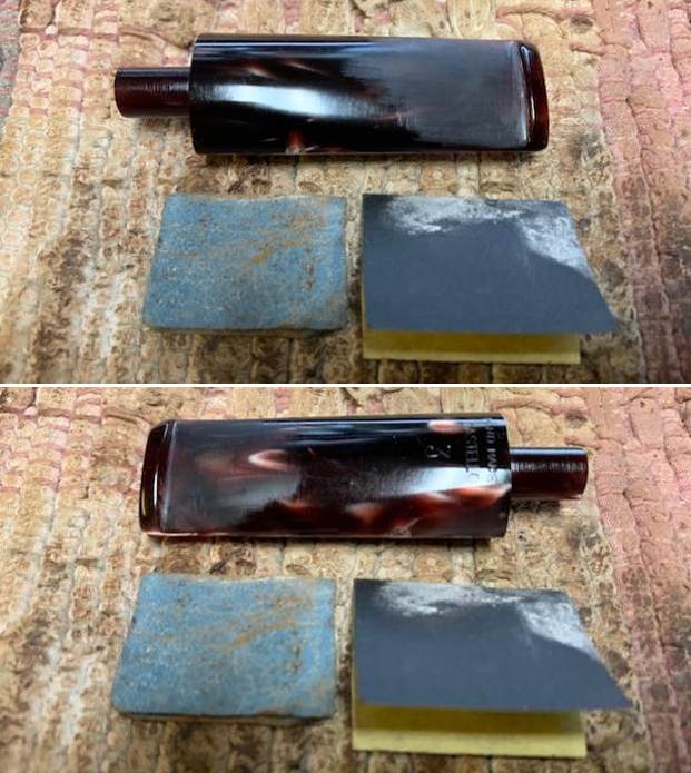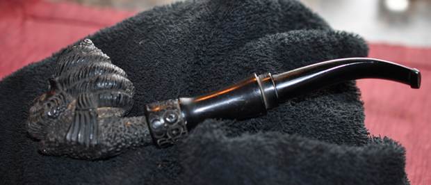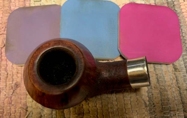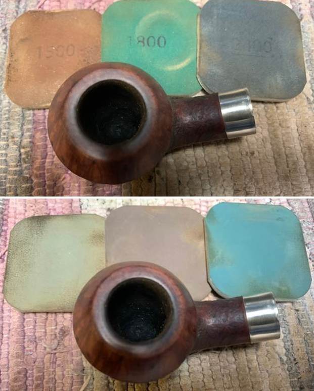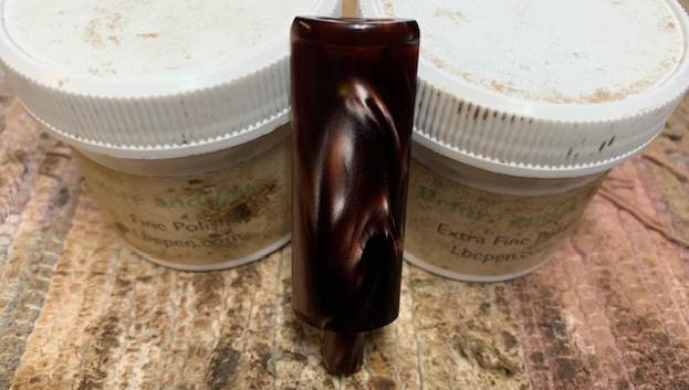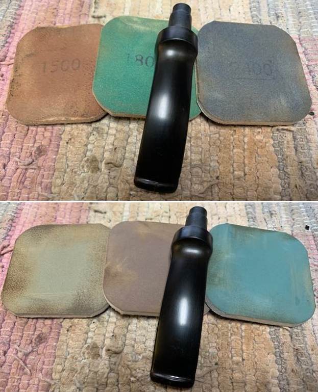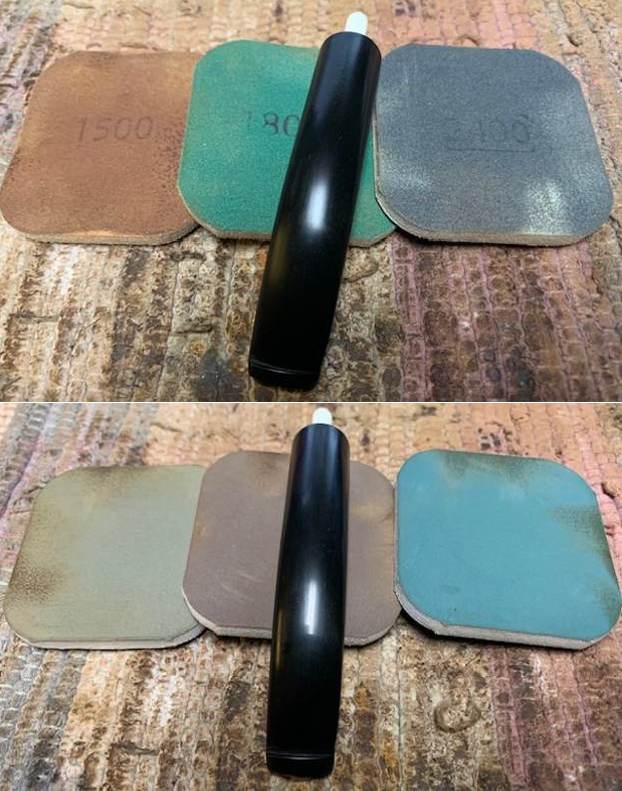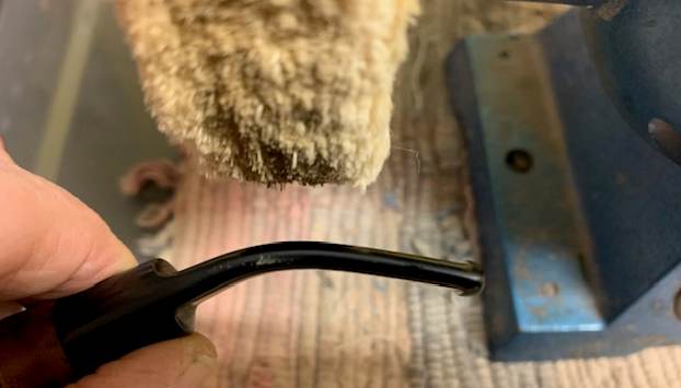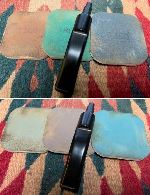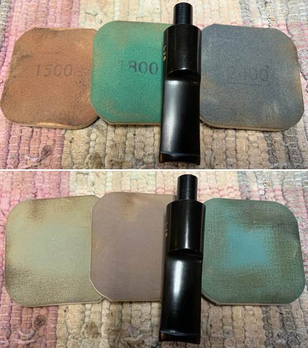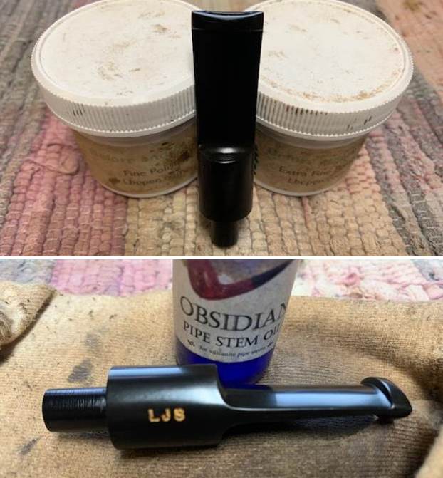 I use micromesh sanding pads and water to wet sand the stem with 1500-12000 grit sanding pads. I wiped it down after each sanding pad with Obsidian Oil on a cotton rag after each sanding pad as I find it does two things – first it protects the vulcanite and second it give the sanding pads bite in the polishing process.