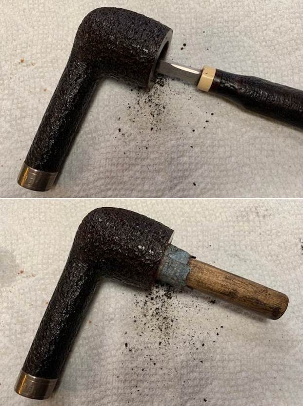 I decided clean up the pipe before I repaired the cracked shank. I reamed the bowl back to bare briar with a Pipenet Pipe Reamer using the third cutting head. I cleaned up the reaming with a Savinelli Fitsall Pipe Knife. I finished the bowl clean up with 220 grit sandpaper wrapped around a piece of dowel. The walls were smooth and there was no sign of burning or checking. It looked very good.