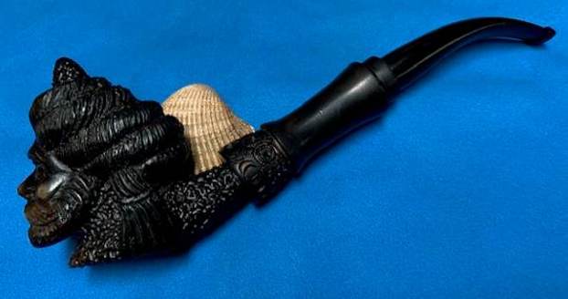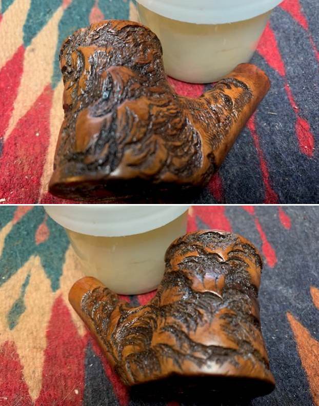 “I looked up Jost’s pipes on the Pipephil site and found a pipe that had the same stamping on the left side of the shank as the one I was working on. The right side had slightly different stamping in that it had the classic COM stamp circle where the one I had was two lines Made in over England. It also had a picture of the circle J stamp on the stem. There was a note there the tobacco shop proprietor was Mrs. Henry A. Jost. Her resident carver was Harvey Raspberry.”