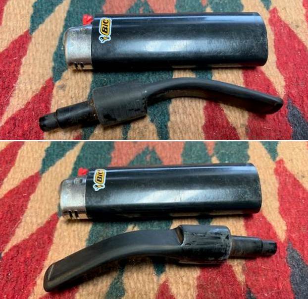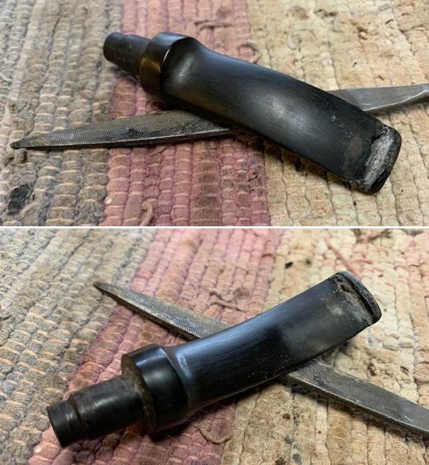 I wanted to adjust the bent in the stem as it had straightened a bit over time. I heated the blade with the flame of a Bic lighter. Once the vulcanite had softened I bent it to the correct angle and set the bend with cool water. It looks much better.
