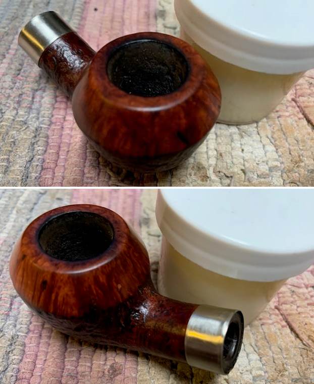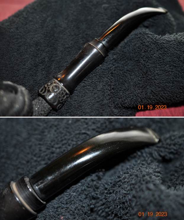 I heated the band with a lighter and pressed it onto the shank end. The fit of the ferrule to the shank was tight and it pulled the crack together even more than my clamping. It covered much of the stamping but the crack was quite long and I wanted some strong coverage. I put the stem on the shank and took photos of the new look of the pipe.