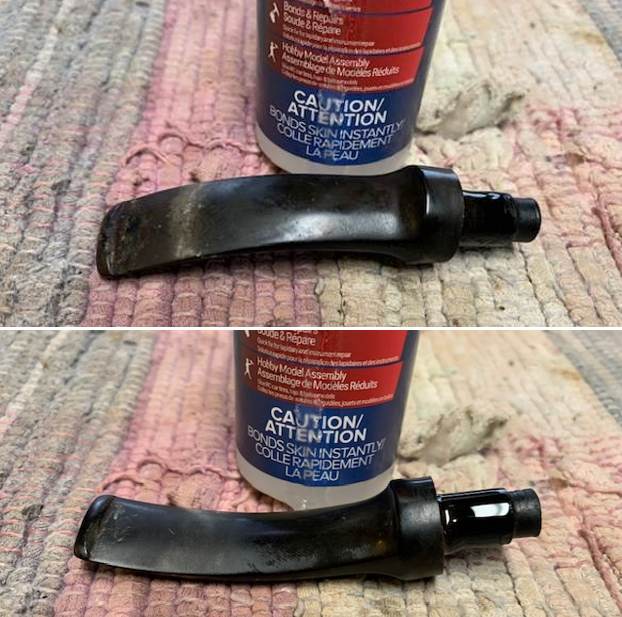 With the internals clean it was time to work on the cracked shank. I drilled a small pinhole at the end of the crack on the right underside of the shank. I do this to stop the crack from further spreading. I fill in the pinhole with clear CA glue and built up the surface of the crack at the same time. I squeezed the crack together and held it until the glue set. I spread the glue with a dental spatula and pressed into the shank crack. Once the repair cured I sanded it smooth with 220 grit sandpaper.