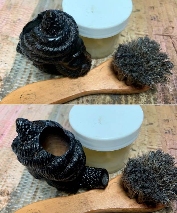 I worked some Before & After Restoration Balm into the smooth rim and the sandblast finish on the bowl and shank. I worked it into the surface of the briar with my fingertips to clean, enliven and protect the wood. I used a horse hair shoe brush to work it into the crevices and keep from building up in the valleys and crevices of the finish. Once the bowl was covered with the balm I let it sit for about 15 minutes and buffed it off with a soft cotton cloth and the shoe brush. I polished it with a microfiber cloth. I took photos of the pipe at this point in the process to show what the bowl looked like at this point.