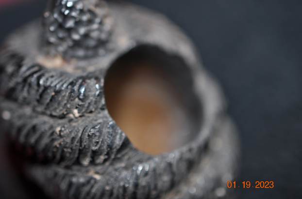 I took photos of the rim top and the thick cake in the bowl to show how it looked. The rim top had some darkening around the inner edge of the bowl. It will clean up pretty well. The photos of the stem show the condition of the stem. You can see the tooth marks and chatter under the calcification on the stem surface.